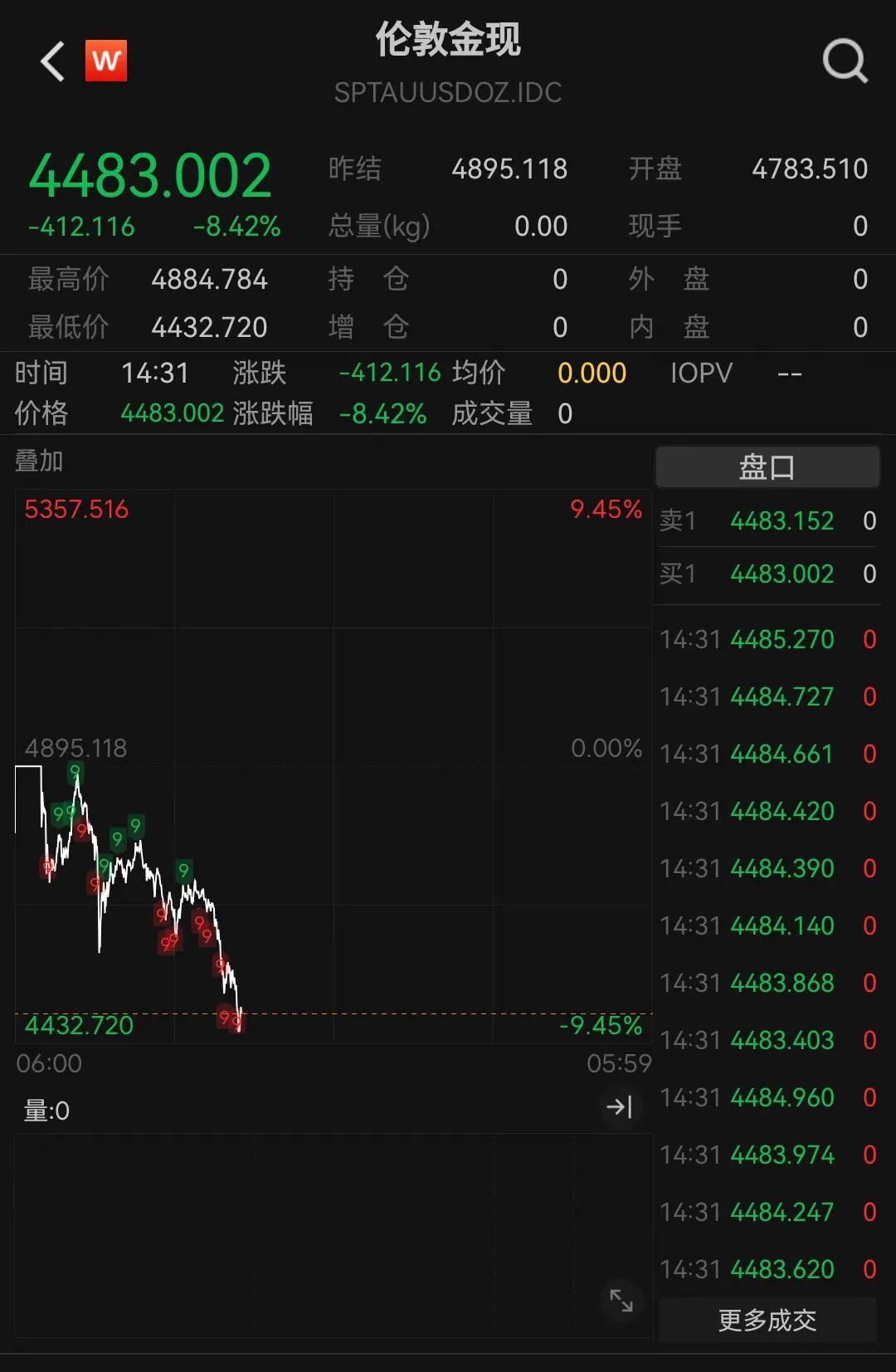 黄金大幅下跌,截至发稿,现货黄金失守4470美元/盎司,日内跌超8%;沪金主力合约触及跌停,跌幅为16%。